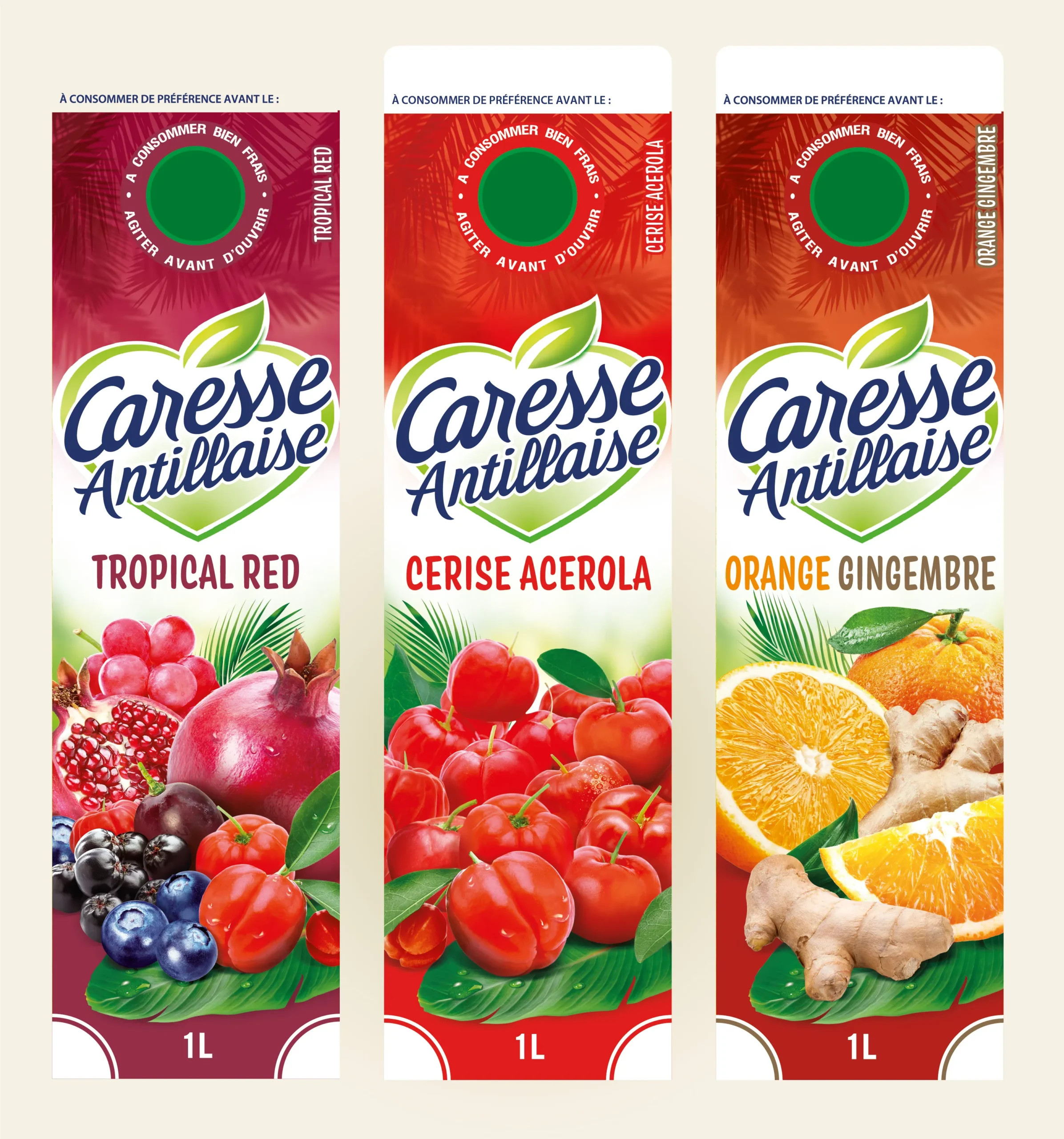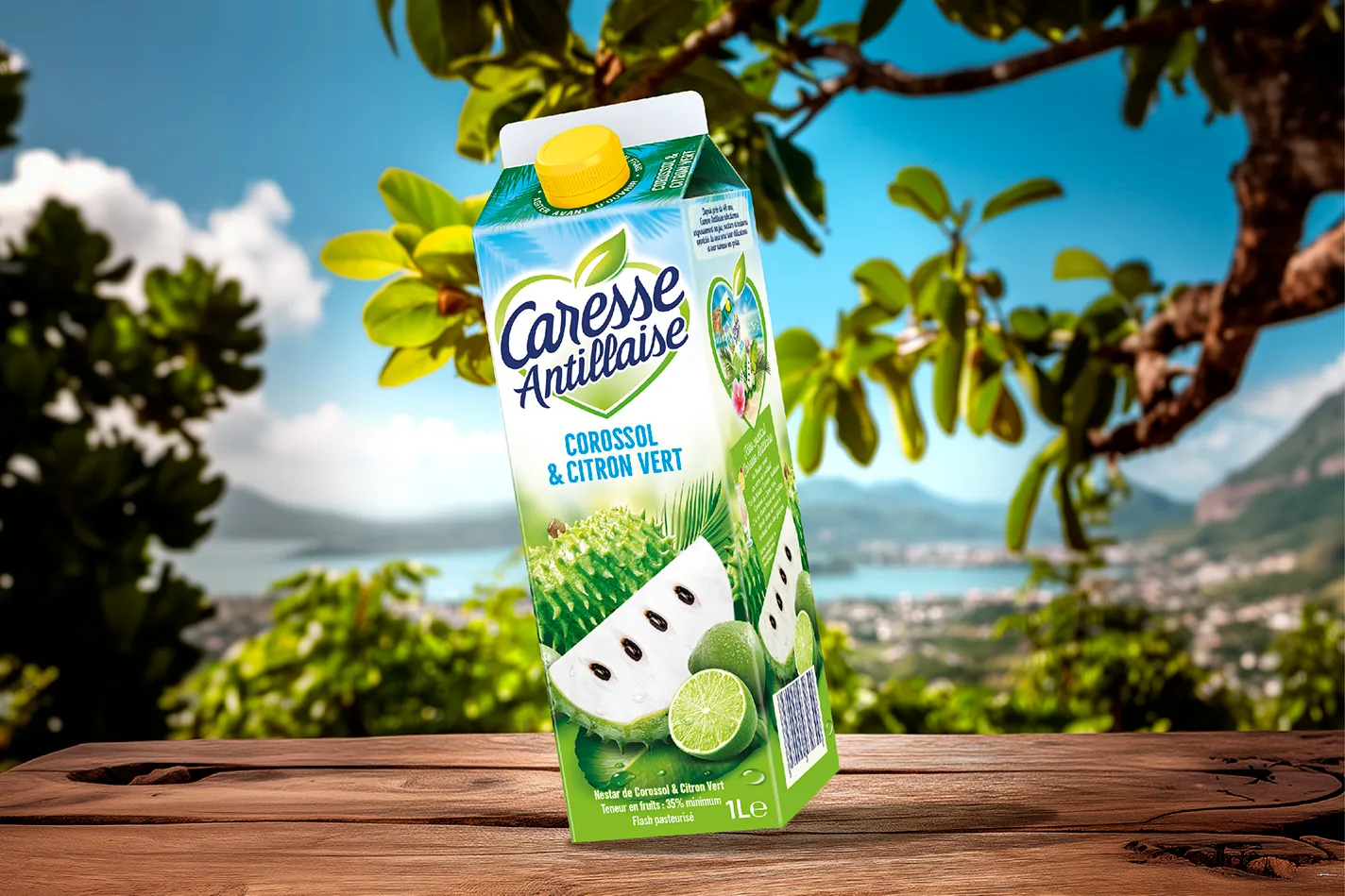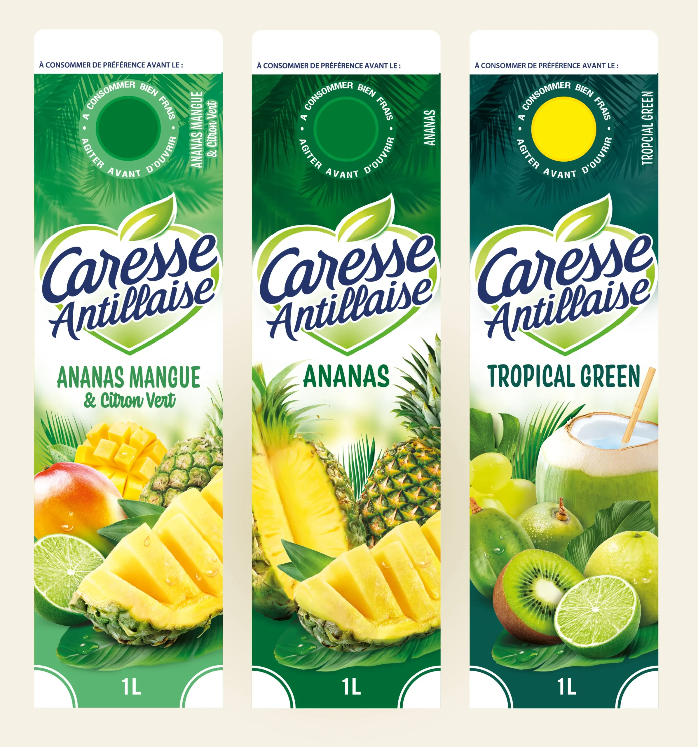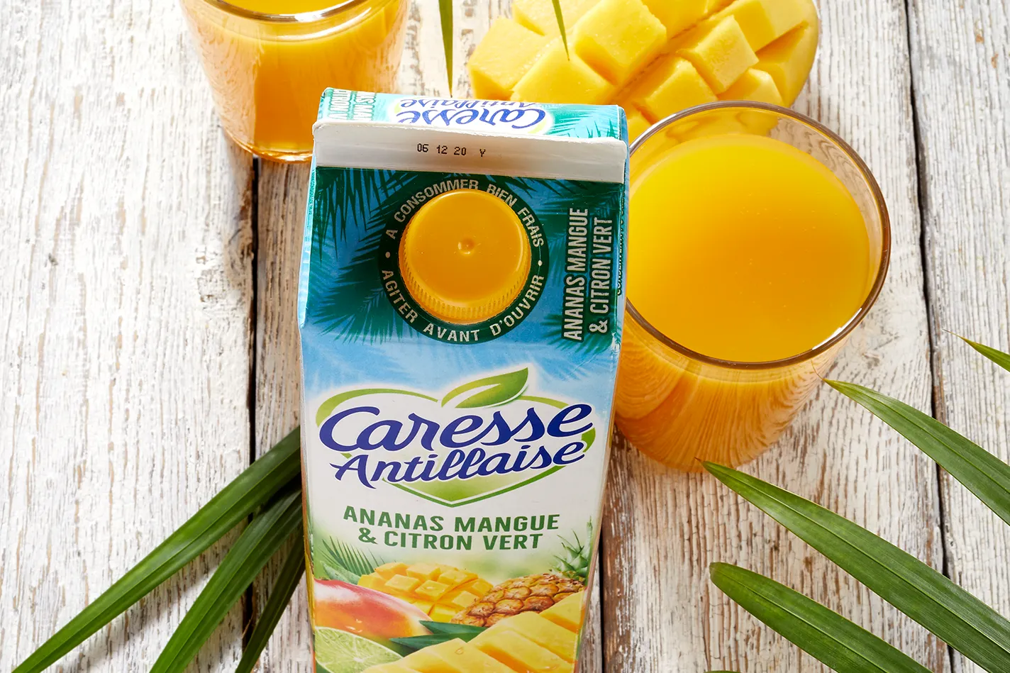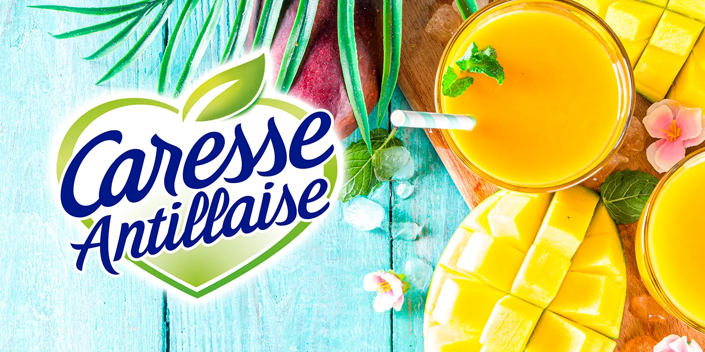 Eclat des fruits emblématiques des Antilles, ambiance baignée de soleil, l’univers visuel de Caresse Antillaise met à l’honneur le patrimoine gustatif et végétal des Antilles. Ce look reconnaissable entre tous se décline en une multitude de recettes de jus, plus savoureuses et colorées les unes que les autres.