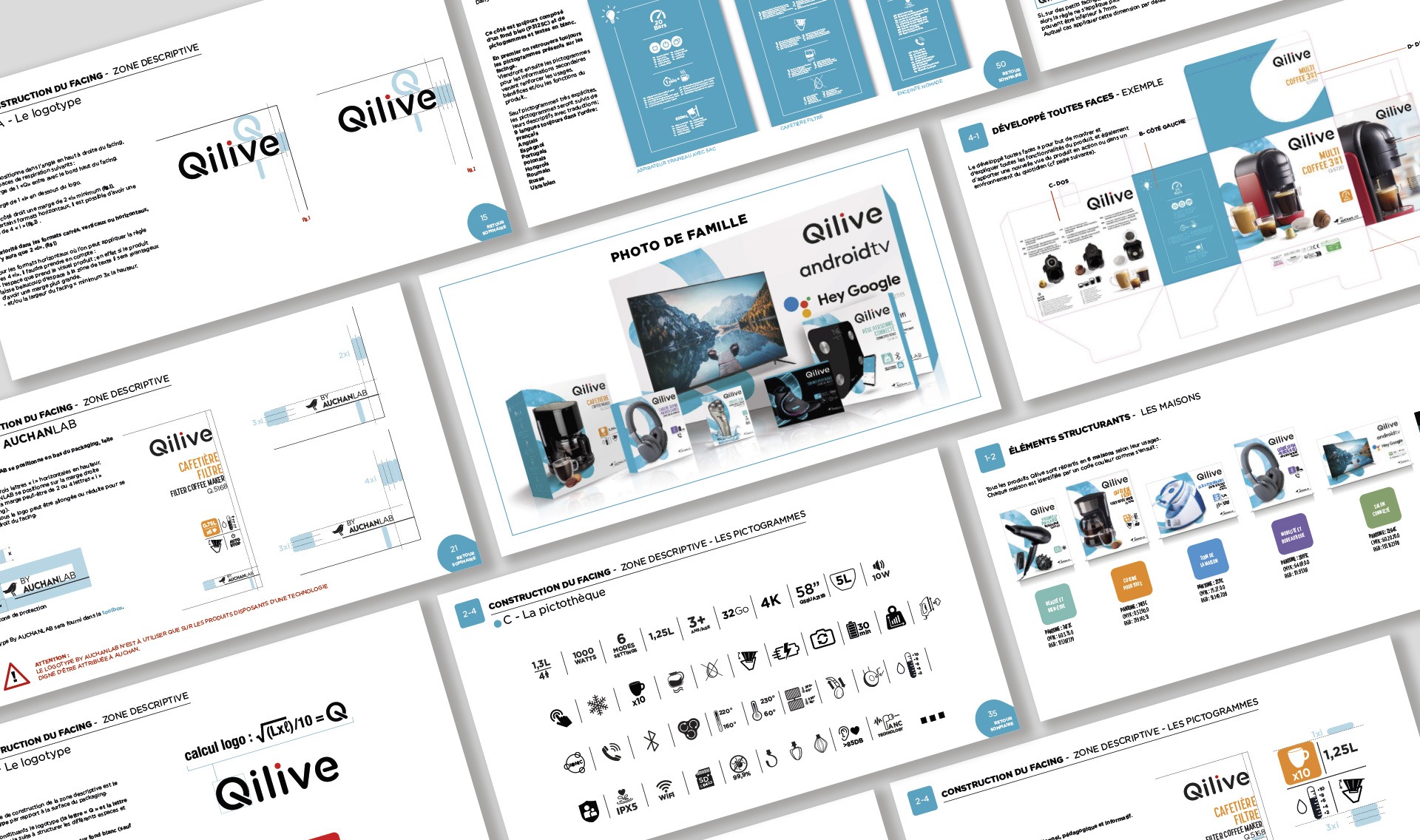 Pour ancrer durablement la nouvelle identité, Duwood a conçu une charte complète : usages du logo, construction des packs, choix coloriels, iconographie, principes de composition. Un système souple mais structuré, pensé pour durer, et surtout pour se déployer avec clarté sur tous les points de contact de Qilive.