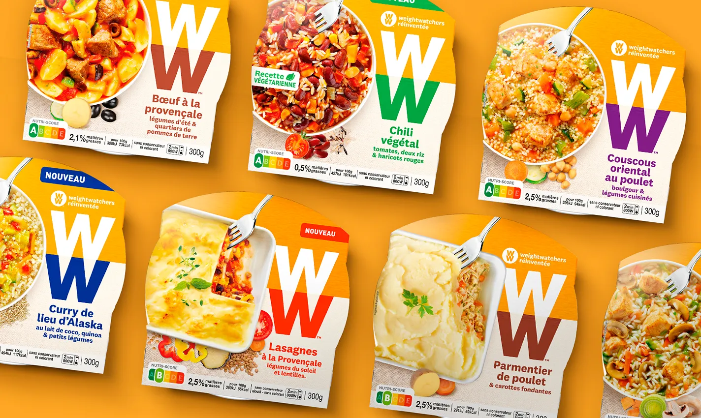 Pour accompagner ce repositionnement, Duwood insuffle du peps et de la clarté : le logo WW, décliné en couleurs variées sur son deuxième W, crée un impact fort en linéaire. Un stylisme culinaire frais et explicite valorise chaque recette (du chili végétal au curry de lieu) avec une promesse : équilibre, modernité et appétit.